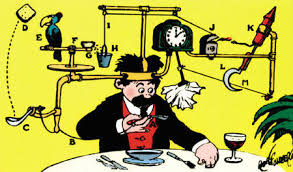 Goldberg's cartoons depicted ridiculously complicated machines, as below.